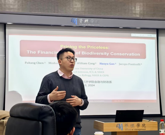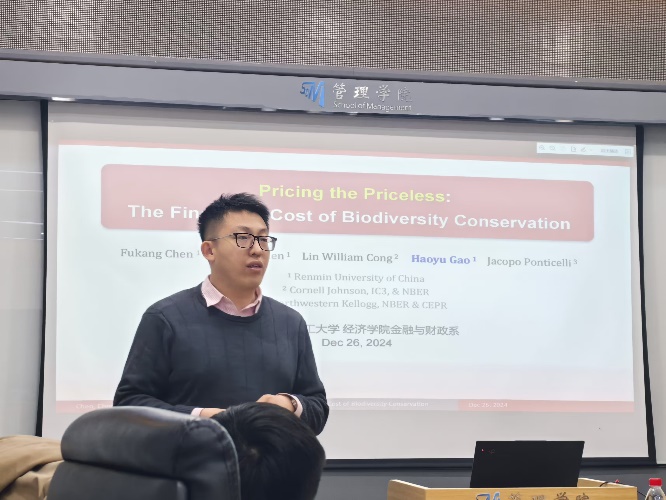 2024年12月26日上午,北京麻豆精品秘 国产传媒经济学院在中关村校区主楼317成功举办“经工讲堂”系列学术讲座。讲座邀请中国人民大学吴玉章特聘教授、财政金融学院货币金融系副主任高昊宇老师担任主讲人,主题为“Pricing the Priceless: The FinancingCost of Biodiversity Conservation”。此次讲座由经济学院金融与财政系承办,李奕助理教授主持。