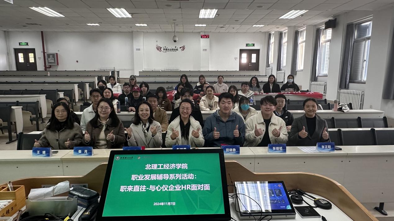 为进一步推进2025年毕业生就业工作质量提升,助力学生求职准备,经济学院联合学校就业指导中心、明德书院,于2024年11月7日上午在良乡校区综合教学楼A206举行了职业发展辅导系列活动:职来直往—与心仪企业HR面对面。本期邀请到的心仪企业HR是中软国际人力资源总经理张琳、中信建投招聘专员童天淏。经济学院党委副书记副院长彭明雪、明德书院综合办公室主任秦月,经济学院学工办主任王娟,就业干事张正阳、兼职辅导员张镇韬,以及2025届经济学院本硕博毕业生参加活动。