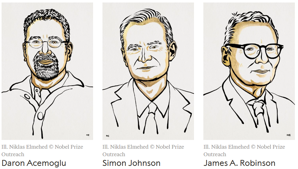 2024年的诺贝尔经济学奖得主的悬念终于揭晓。2024年10月14日,瑞典皇家科学院秘书长宣布瑞典央行纪念阿尔弗雷德·诺贝尔经济科学奖将颁发给MIT教授达隆·阿西莫格鲁(Daron Acemoglu)、MIT教授西蒙·约翰逊(Simon Johnson)、芝加哥大学教授詹姆斯·A·罗宾逊(James A. Robinson),以表彰三人在“对制度的形成及其对繁荣的影响的研究”,奖金1100万瑞典克朗(约745万人民币),由三位获奖者平分。