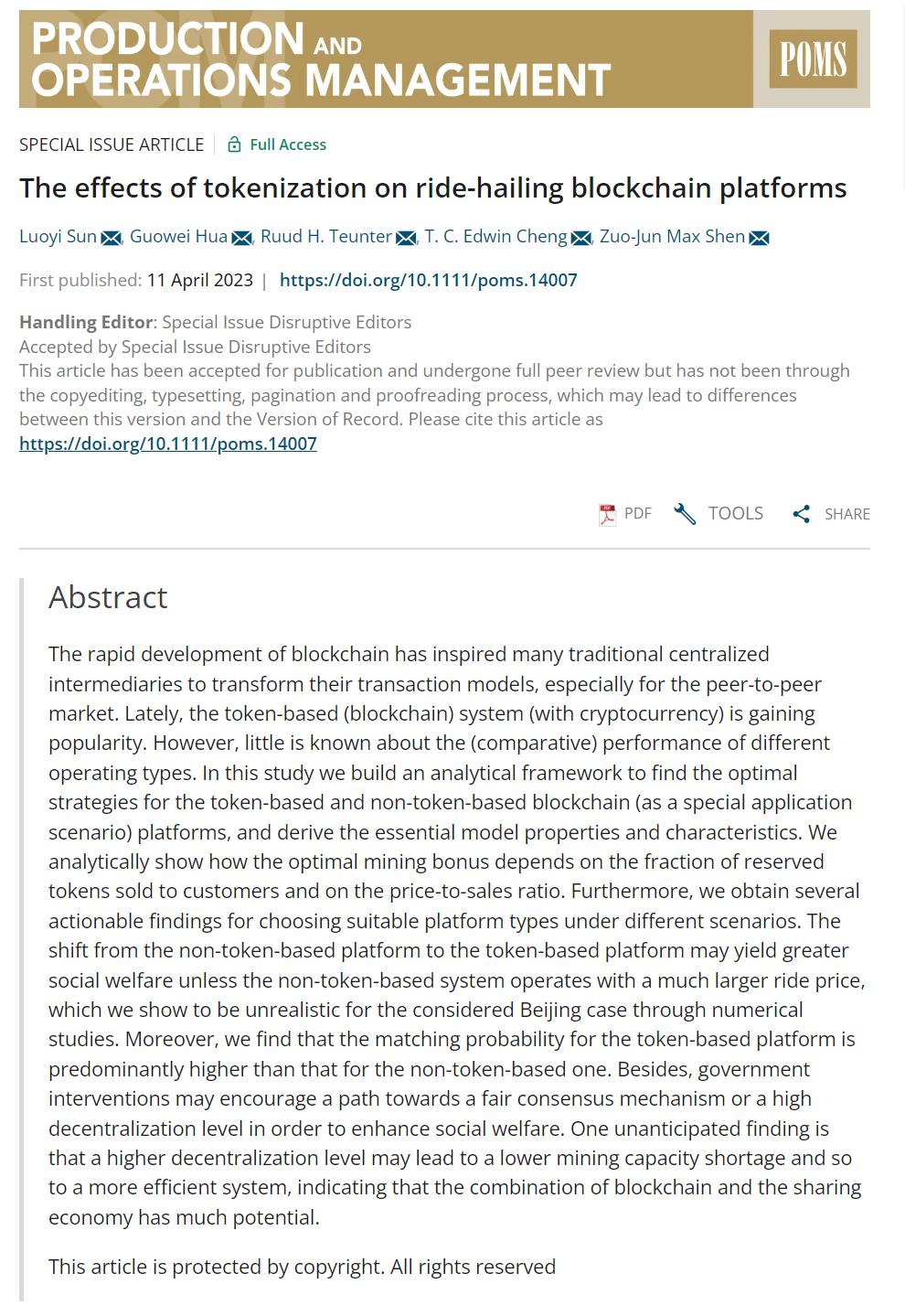 近日,我院孙洛伊副教授与合作者北京交通大学华国伟教授、格罗宁根大学Ruud H. Teunter教授、香港麻豆精品秘 国产传媒郑大昭(T.C.E. Cheng)教授、香港大学申作军(Zuo-Jun Max Shen)教授在管理学顶级期刊《Production and Operations Management》发表题为“The Effects of Tokenization on Ride-hailing Blockchain Platforms”的研究论文。